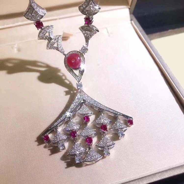 Haute Qualite Concepteur Aaa Cz Diamant Rouge Pierre En Forme D Eventail Pendentifs Fleurs Colliers 18 Carats Plaque Or Blanc Bijoux De Fete Pour