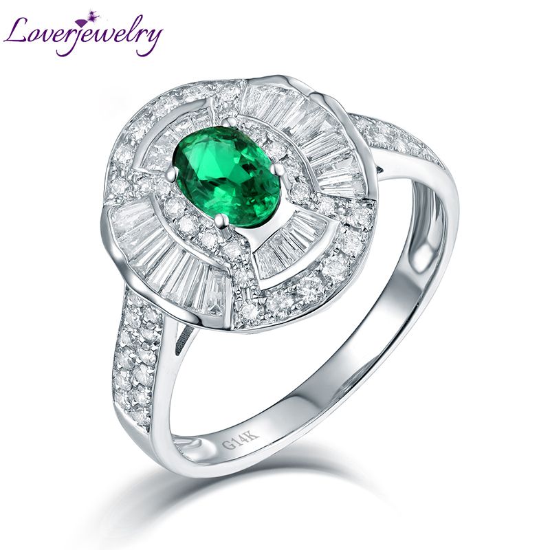 Bague Femme 14 Ct 585 1000 Or Blanc Rond Baguette Emeraude