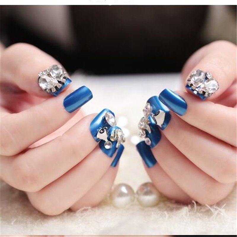 24 Unids Set Frances 3d Nupcial De La Boda Unas Postizas Nail Art Design Diamante Azul Acrilico Completo Consejos De Unas Falsas Para Nail Art Tool